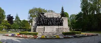 The memorial has a large base of Shap granite, with three steps up to a rusticated plinth and screen wall. In total the pedestal and decoration is 8 metres (26 ft) high x 14 metres (46 ft) wide x 2.5 metres (8.2 ft) deep. The large black bronze sculpture, 3 metres (9.8 ft) high x 10 metres (33 ft) wide, was founded by A.B. Burton at the Thames Ditton Foundry of Thames Ditton.[2] The sculpture portrays dozen of figures,[3] including two drummer boys and men saying goodbye to their loved ones, expressing both patriotism and anguish. An angel—an allegorical depiction of Renown—blows a trumpet and flies over the crowd.[2] The scene recalls the mobilisation of the 5th Northumberland Fusiliers in April 1915, who marched on the Great North Road to Newcastle Station.[3] On the back of the memorial, three figures are carved into the granite. St George in the centre, is supported on a bracket formed from two seahorses, with the arms of Newcastle to either side. Two soldiers in the uniform of the Northumberland Fusiliers stand either side of St George, one from the First World War to the right, and one from the founding of the regiment in 1674 to the left.[2] The base of the memorial is surrounded by municipal patches of flowers, which used to be a more simple patch of grass.[3]