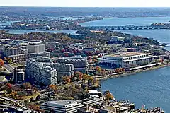 Northwest contains many college campuses, including American University, George Washington University, Georgetown University, Howard University, and the University of the District of Columbia. Northwest also contains many primary and secondary schools, many of which are public schools administered by DCPS (District of Columbia Public Schools). There are 44 DCPS institutions in Northwest,[4] as well as many private schools, including St. John's College High School, Sidwell Friends School, Gonzaga College High School, Duke Ellington School of the Arts, and Georgetown Day School, among others.[5] The Capital One Arena, home of the Washington Wizards, the Washington Capitals, and the Georgetown Hoyas as well as the venue for many concerts and other events, is located in the District's Chinatown in Northwest. The National Cathedral, the White House, Rock Creek Park, and Embassy Row are also located in this quadrant.