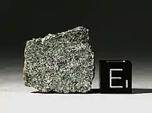 Northwest Africa 7325, also known as NWA 7325, is a unique igneous meteorite which crystallized as a basalt on a large asteroid or planetesimal approximately 4.56 billion years ago. It is classified as an ungrouped achondrite, and is notable for its green fusion crust and high-magnesium/low-iron composition.[1][2] It was purchased from anonymous finders in a marketplace in Erfoud, Morocco in April 2012.[2] The original find was composed of 35 fragments with a combined weight of approximately 345 grams (12.2 oz), however many additional fragments with a total weight of over 1,100 grams (39 oz) were subsequently recovered.[3]