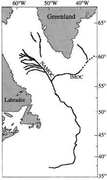 The Northwest Atlantic Mid-Ocean Channel (NAMOC) is the main body of a turbidity current system of channels and canyons running on the sea bottom from the Hudson Strait, through the Labrador Sea and ending at the Sohm Abyssal Plain in the Atlantic Ocean. Contrary to most other such systems which fan away from the main channel, numerous tributaries run into the NAMOC and end there. The density of those tributaries is the highest near the Labrador Peninsula, but the longest tributary, called Imarssuak Mid-Ocean Channel (IMOC), originates in the Atlantic Ocean.