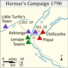 On 20 April 1790, the First American Regiment participated in its first offensive against Native Americans when General Josiah Harmar joined Kentucky General Charles Scott in an attack on the Shawnee village of Chalawgatha. The next month, Native Americans retaliated by attacking settlers near Limestone (modern-day Maysville, Kentucky) in a skirmish known as Hartshorne's Defeat, leaving 5 settlers dead and 8 missing.[41] That autumn, the United States launched a major offensive against the Natives along the Maumee River. This punitive expedition was led by General Harmar, whose orders were to destroy Kekionga and the surrounding towns, killing any Natives who opposed him.[42] His army, consisting of 1,100 militiamen and 320 regulars, departed Fort Washington on the Ohio River on September 30.[43] A diversionary force led by Major Jean François Hamtramck invaded from Vincennes, though it turned back before joining with Harmar.[44]