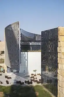 NU-Q's permanent home in Education City was designed by American architect Antoine Predock. Predock traveled around the world, deriving inspiration from desert structures to give NU-Q's new building a look and feel appropriate to Qatar's culture, climate, and location.