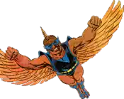 Through yet undisclosed events, the Feitherans have evolved into an even more bird-like state, including Northwind (modeled after Hawkman's look in Kingdom Come), and New Feithera has been destroyed. The Feitherans have apparently lost the power of speech, but not their intelligence. It has yet to be revealed how, but Black Adam was able to convince Northwind and the other Feitherans to join him and take over his ancestral homeland Kahndaq.[10] The JSA responded to the hostile takeover by attacking Kahndaq and Black Adam's group, which included two other Infinitors; Nuklon, now going by the name Atom Smasher and Brainwave Jr. as well as a new Nemesis and Eclipso. The conflict resulted in Hawkman ripping off one of Northwind's wings,[11] but thanks also to some form of advanced healing the Feitherans have gained, Northwind has already recovered it.
