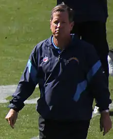 The Chargers started 3–1 in 2012 for the second straight season.[14] They then lost two games in a row which they led by double digits in the second half, including a 35–24 loss to the Denver Broncos which San Diego led 24–0 at halftime.[15][16] They lost a third such game after leading in the second half 13–3 with 7:51 remaining before losing 16–13 in overtime to the Baltimore Ravens. The Ravens faced fourth-and-29 at their own 37 with 1:37 left when running back Ray Rice caught a pass one yard past the line of scrimmage and escaped defenders to run 28 yards for the first down.[17][18][19] After being 8–0 under Turner in November from 2009–2010, San Diego was 1–7, the second-worst November record in the league since 2011.[17] On December 6, U-T San Diego reported that Turner and Chargers general manager A. J. Smith would be fired at the end of the season. However, Chargers president Dean Spanos denied the report, saying that final evaluations would be made at the end of the season.[20] San Diego at 7–9 had its first losing season since 2003, Smith's first season as GM.[10] Turner and Smith were both fired by the San Diego Chargers on December 31, 2012.[21] Turner had one year remaining on his contract, and left with a 59–43 record in his six-year stint with the Chargers.[10] He had the support of the players through the end of his tenure, and received a standing ovation in his final meeting with them after being fired.[10][22] San Diego never made the Super Bowl under Turner despite having what was perceived as one of the league's most talented rosters.[8] This failure to win a Super Bowl after replacing the popular Schottenheimer is believed by some to partially cause San Diego fans and citizens distrusting team management and contributing to the team's 2017 exit from San Diego. Turner believed the Chargers were the most talented team in the AFC West in his first three seasons, but not in his final three when the team lost talented players.[23] He inherited a team with 11 Pro Bowl players in 2006, but had no players voted to the NFL's All-Star game in 2012.[8] During Smith’s tenure, the Chargers lost players such as LaDainian Tomlinson, Darren Sproles, Michael Turner and Vincent Jackson. Drew Brees, however, was replaced by Philip Rivers in a decision to go with the younger quarterback. The Chargers' offensive line grew weak in 2012. Quarterback Philip Rivers was frequently forced to scramble and was sacked 49 times, contributing to his 22 turnovers — 47 over the previous two seasons.[8]