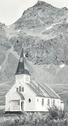 The church, one of the world's southernmost churches, was consecrated on Christmas Day in 1913. In 1922, a funeral service for Sir Ernest Shackleton was conducted in the church before his burial amongst 64 others in the church cemetery.[3] The cemetery, located approximately 700 metres (2,300 ft) to the south on the other end of Grytviken Harbour, also holds empty graves for lost whalers at sea.[4]