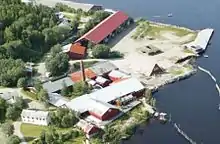 In total, the production facility and the newer drying building have a ground area of about 2,960 square metres (31,900 sq ft), which makes this building one of the largest wooden buildings in the Nordic countries.