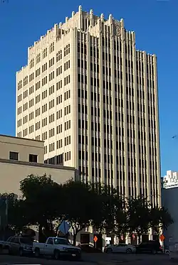 The Norwood Tower is a sixteen-story steel-frame building clad with precast concrete panels.[5] Its design exemplifies the Gothic Revival (or "Commercial Gothic") architectural style common among 1920s-era Texas high-rise buildings,[7] with its vertical lines, Gothic tracery, pinnacled roof line and gargoyles; the tower remains the only high-rise building in Austin built in this style. The building was designed by local architects Bertram Giesecke and August Watkins "Watt" Harris. The general contractor for its construction was Frank Barron.[3]