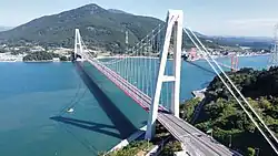 Noryang Bridge (Hangul: 노량대교) or Second Namhae Bridge is a suspension bridge that connects Hadong Noryang and Namhae Noryang, South Korea. It carries the National Route 19 near the Namhae Bridge inaugurated in 1973.