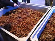Around the communes of Calavino, Cavedine, Lasino, Padergnone and Vezzano nearly 10 hectares (25 acres) of Nosiola are dedicated to being the sole variety behind the rare Vin Santo dessert wine made under the Trentino DOC. Allowed to dry out on racks after harvest, the Nosiola berries lose 60–80% of their original weight, leaving a very low yield of juice after pressing. The slow fermentation and 7–10 years of barrel and bottle aging usually contributes to an average annual production of around 30,000 half (375 ml) bottles of the dessert wine.[4]