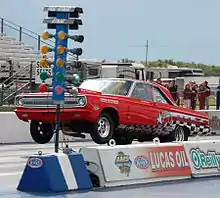 Nostalgia Super Stock is an index-style foot brake only class for the year models, body styles, and engine combinations which raced in the A/FX and Super Stock classes of the ’60s. Exceptions in the authenticity of these cars will be allowed, for instance those relating to safety, equality in performance, availability, and durability. Sandbagging, excessive braking near the finish line or excessive mph for a given e.t. is subject to result in a disqualification. The class will qualify by elapsed time closest to index, be paired according to qualifying positions, and then advance to eliminations.[3]