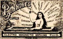 Another publicity method – undertaken mostly by smaller firms – was the medicine show, a traveling circus of sorts that offered vaudeville-style entertainments on a small scale, and climaxed in a pitch for some sort of cure-all nostrum. "Muscle man" acts were especially popular on these tours, for this enabled the salesman to tout the physical vigour the product supposedly offered. The showmen frequently employed shills, who stepped forward from the crowd to offer "unsolicited" testimonials about the benefits of the medicine.[14] Often, the nostrum was manufactured and bottled in the wagon in which the show travelled. The Kickapoo Indian Medicine Company became one of the largest and most successful medicine show operators. Their shows had an American Indian or Wild West theme, and employed many American Indians as spokespeople such as the Modoc War scout Donald McKay.[15] The "medicine show" lived on in American folklore and Western movies long after they vanished from public life.