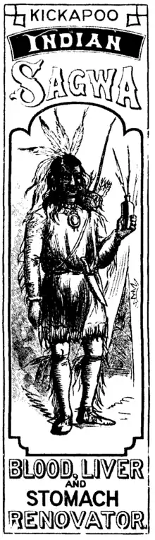 Native American themes were also useful: natives, imagined to be noble savages, were thought to be in tune with nature, and heirs to a body of traditional lore about herbal remedies and natural cures. One example of this approach from the period was Kickapoo Indian Sagwa, a product of the Kickapoo Indian Medicine Company of Connecticut (completely unrelated to the real Kickapoo Indian tribe of Oklahoma), supposedly based on a Native American recipe.[16] This nostrum was the inspiration for Al Capp's "Kickapoo Joy Juice," featured in the comic strip, "Li'l Abner". Another benefit of claiming traditional native origins was that it was nearly impossible to disprove. A good example of this is the story behind Dr. Morse's Indian Root Pills, which was the mainstay of the Comstock patent medicine business. According to text on a wrapper on every box of pills, Dr. Morse was a trained medical doctor who enriched his education by travelling extensively throughout Asia, Africa, and Europe. He supposedly lived among the American Indians for three years, during which time he discovered the healing properties of various plants and roots that he eventually combined into Dr. Morse's Indian Root Pills. No one knows if Dr. Morse ever actually existed.