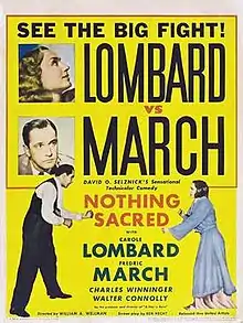 Nothing Sacred is a 1937 American Technicolor screwball comedy film directed by William A. Wellman, produced by David O. Selznick, and starring Carole Lombard and Fredric March with a supporting cast featuring Charles Winninger and Walter Connolly. Ben Hecht was credited with the screenplay based on the 1937 story "Letter to the Editor" by James H. Street, and an array of additional writers, including Ring Lardner Jr., Budd Schulberg, Dorothy Parker, Sidney Howard, Moss Hart, George S. Kaufman and Robert Carson made uncredited contributions.