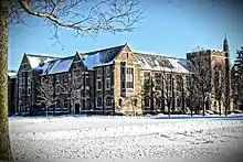 Eck Hall was built in 2010. The $57-million, 85,000-square-foot building was connected to the original building through a suspended walkway that constitutes a common area. Eck includes both classrooms and faculty and administrative offices, as well as space for student services and activities. In addition to a 205-seat moot courtroom, the Patrick F. McCartan Courtroom, there are four lecture halls, five seminar rooms, and three skills training rooms available for classes and events.[38] The construction of Eck and the connecting walkway to Biolchini also allowed for the creation of a new chapel dedicated to St. Thomas More. The building was named in honor of school graduate, benefactor, and advisor Frank E. Eck.[39]