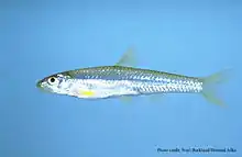 The back and sides above the lateral line are pale yellow, with a dusky cross-hatched pattern and a thin, but noticeable, middorsal stripe. The lower sides and ventral side is typically silvery or silvery white. Though usually obscure or absent, some fish may have a faint lateral stripe, especially on the caudal peduncle; pigment of the lateral stipe is confined to the areas above the lateral-line. There is no concentration of melanophores at the base of the caudal fin and all fins lack dark pigment. The fins of breeding individuals, particularly males, have a bright lemon yellow pigment. Males may also have yellow snouts.[3]