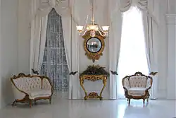 Nottoway has over an acre of floor space spread out over three floors and a total of 64 rooms with 165 doors and 200 windows, most of which can double as doors. The house enjoyed 19th-century novelties such as a bathroom on each floor with flushing toilets and hot and cold running water, gas lighting throughout the house, and a complex servant call-bell system. The principal rooms of the house are located on the second floor. The entrance hall runs the length of the house and is 12 feet wide and 40 feet long. Large Baccarat crystal and brass chandeliers hang from the 15.5 feet (4.7 m) high ceilings and the doors with hand-painted German Dresden porcelain doorknobs and matching keyhole covers, leading to the adjacent rooms are 11 feet (3.4 m) tall. Above the doors and along the ceilings are plaster frieze moldings, with modillions interspersed with paterae, made from mud, clay, horse hair, and Spanish moss. To the right of the entrance hall is the most unusual, and John Randolph's favorite room in the house is the White Ballroom. With Corinthian columns, hand-cast archways, and an L-shaped extension into a curved bay, Randolph had it painted entirely white, including the flooring, to show off the natural beauty of his seven daughters, six of whom would be married there. Featuring two fireplaces with hand-carved rococo white marble mantles, there is also an original mirror placed so that the women could see if their ankles or hoops were showing beneath their skirts. Over one of the fireplaces, there is a painting of Mary Henshaw (no relation to the family), whose eyes are said to follow the viewer around the room. Flanking the entrance hall to the left are a gentleman's study, a stair hall, and the formal dining room. The study and the dining room feature black Italian hand-carved marble mantles on their coal-burning fireplaces, and the rooms are filled with period antique furniture. The dining room plasterwork showcases pink camellias, Emily Randolph's favorite flower, and is the only plasterwork in the house to have color.