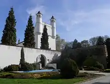 The Church of the Assumption of the Virgin Mary is the landmark of the historic centre. It has a Renaissance 66 m (217 ft) high tower from 1587. The original Gothic castle was replaced by the current building by the Jesuits in 1732–1740.[14]