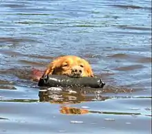 The Nova Scotia Duck Tolling Retriever is a medium-sized gundog bred primarily for hunting. It is often referred to as a "toller". It is the smallest of the retrievers, and is often mistaken for a small Golden Retriever. Tollers are intelligent, eager to please, alert, and energetic.[1] The name "toller" is derived from their ability to lure waterfowl within gunshot range. The breed originated in Yarmouth County, Nova Scotia, Canada.[2] The American Kennel Club ranks the toller as the 87th most popular dog breed.[1]
