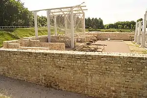 Water supply to the fortress, particularly the baths including the nearby nymphaeum and to the town was ensured by three known aqueducts, one of which was at least 9 km long and fed the distribution tank (castellum divisorum) at the south-east corner of the fortress.[12]