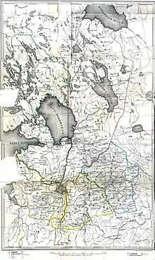 Novgorodian Land (Russian: Новгородская земля) was one of the largest historical territorial–state formations in Russia, covering its northwest and north. Novgorod Land, centered in Veliky Novgorod, was in the cradle of Kievan Rus' under the rule of the Rurikovich dynasty and one of the most important princely thrones of the era. During the collapse of Kievan Rus' and in subsequent centuries, Novgorod Land developed as the Novgorod Republic: an autonomous state with republican forms of government under the suzerainty of the great princes of Vladimir-Suzdal (later – Moscow/Muscovy).[1][2] During the period of greatest development, it reached north to the White Sea, and in the east it spread beyond the Ural Mountains. It had extensive trade relations within the framework of the Hanseatic League and with the rest of Rus'. Muscovy conquered the Novgorod Republic in 1478, and annexed it in 1578,[3] although Novgorod Land continued to exist as an administrative unit until 1708.