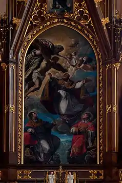 The original church was first mentioned in 1428, although it was built before this. The chancel with three bays walled on five of eight sides has been preserved from that time. In 1493, when the chapter was established, a reconstruction was started and lasted until 1623. In 1576, the building was damaged in a fire. Its renovation was financed by the provost Polidoro de Montagnana, who ordered the construction of a new high altar and acquired the oil painting The Vision of Saint Nicholas (c. 1582) by the Venetian Mannerist painter Tintoretto for it. In 1621, the nave area with Baroque arches and three Baroque chapels on each side were constructed. In the 19th century, the church was reworked in the Gothic style. In 1733, new side altars with paintings by Valentin Metzinger were installed. In 1860, a new polygonal belfry was erected in the shell of an older one on the west side of the church. The main altar was renovated in 1868 by Matija Tomc. In 1901, the chancel was decorated by Matija Koželj.