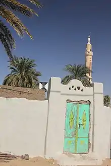 Modern Nubian architecture in Sudan is distinctive, and typically features a large courtyard surrounded by a high wall. A large, ornately decorated gate, preferably facing the Nile, dominates the property. Brightly colored stucco is often decorated with symbols connected with the family inside, or popular motifs such as geometric patterns, palm trees, or the evil eye that wards away bad luck.[52]