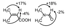 The NOE developed from the theoretical work of American physicist Albert Overhauser who in 1953 proposed that nuclear spin polarization could be enhanced by the microwave irradiation of the conduction electrons in certain metals.[5] The electron-nuclear enhancement predicted by Overhauser was experimentally demonstrated in 7Li metal by T. R. Carver and C. P. Slichter also in 1953. [6] A general theoretical basis and experimental observation of an Overhauser effect involving only nuclear spins in the HF molecule was published by Ionel Solomon in 1955.[7] Another early experimental observation of the NOE was used by Kaiser in 1963 to show how the NOE may be used to determine the relative signs of scalar coupling constants, and to assign spectral lines in NMR spectra to transitions between energy levels. In this study, the resonance of one population of protons (1H) in an organic molecule was enhanced when a second distinct population of protons in the same organic molecule was saturated by RF irradiation.[8] The application of the NOE was used by Anet and Bourn in 1965 to confirm the assignments of the NMR resonances for β,β-dimethylacrylic acid and dimethyl formamide, thereby showing that conformation and configuration information about organic molecules in solution can be obtained. [9] Bell and Saunders reported direct correlation between NOE enhancements and internuclear distances in 1970 [10] while quantitative measurements of internuclear distances in molecules with three or more spins was reported by Schirmer et al. [11]