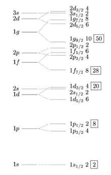 In order to get these numbers, the nuclear shell model starts from an average potential with a shape somewhere between the square well and the harmonic oscillator. To this potential, a spin orbit term is added. Even so, the total perturbation does not coincide with experiment, and an empirical spin orbit coupling must be added with at least two or three different values of its coupling constant, depending on the nuclei being studied.