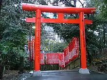 A traditional Japanese torii gate. Slightly below the top rail is a second horizontal rail, called nuki, which is an example of a nuki joint.