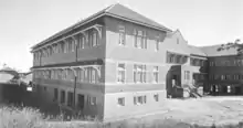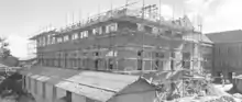 Construction of the northern wing by day labour commenced after the former head teacher's residence, which stood on the building site, was sold for removal.[68][69] The hip-roofed wing, aligned east–west and perpendicular to Bage Street, consisted of two storeys above an undercroft. Each floor comprised four classrooms for 40 pupils, a cloakroom and connecting corridors. By means of folding partitions each floor of this wing could be converted into one large room. One classroom on the first floor was raised 600 millimetres (24 in) to form a stage. The undercroft comprised lavatory accommodation for girls and female teachers and a concreted play area. The building's estimated cost was £9,890.[68][70][71][72][73][74] Temporary brick walls with lime mortar and a fibrous-cement gable infill were constructed where the range was to be connected.[75][1]