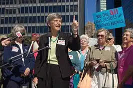 The Nuns on the Bus were at one time criticized by the Vatican under Benedict XVI's leadership for having "serious doctrinal problems" and "radical feminist themes incompatible with the Catholic faith." When American religious sisters were under investigation by the Vatican, the International Union of Superiors General, in contrast, issued a strong statement of support for U.S. women religious congregations. The IUSG praised American women religious for living up to the directives and spirit of the Second Vatican Council.[2] Unlike U.S. Bishops at that time, the Nuns on the Bus group was supportive of national health care legislation known as Obamacare.[3] Simone Campbell was one of the American nuns targeted by then Pope Benedict XVI in 2012 through his controversial investigation of the Leadership Conference of Women Religious. The Vatican investigators accused the American nuns of insufficient adherence to traditional doctrines. However, Pope Francis ended the investigation in 2015 and reconciled with the American nuns.[4]