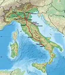 - Naples - Rome - Florence - Bologna - Rovigo - Padua - Venice - Portogruaro - Latisana - Monfalcone - Trieste