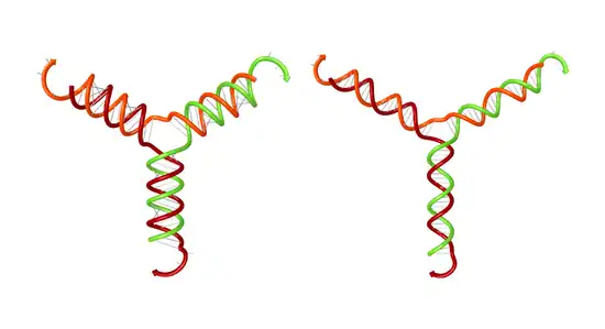 The Utilities page enables depicting secondary structures with ideal helical geometry for stacked base pairs, as for this complex of three RNA strands with A-form helices (left) or three DNA strands with B-form helices (right).