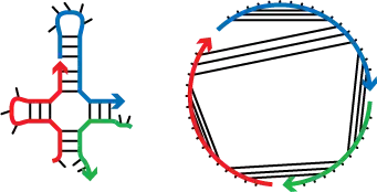 An example secondary structure drawing (left) and the corresponding polymer graph (right). Backbones are represented by thick colored lines and bases and base pairs are represented by thin black lines.
