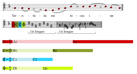 Although the standard modern version of this chant has seventeen notes for the first four words, late medieval chant books such as the ones used in Florence in the early 15th century, have only fourteen notes. These fourteen notes are used as a canonic color in the two tenors, with an interlocking talea pattern (the rhythm patterns of the two tenor parts are different from each other) that totals 28 longa notes, of which the first 14 are rests. This interlocked pair of tenor parts is stated four times, following a diminution scheme in which the identical notation is interpreted under four different mensuration signs, first in tempus perfectum in integer valor (each longa transcribed as a 6/2 bar), then in tempus imperfectum in integer valor (transcribed as 4/2), then in tempus imperfectum diminutum (4/4), and finally in tempus perfectum diminutum (6/4), resulting in total length proportions of 6:4:2:3.[6] This is unusual for isorhythmic motets, in which the sections normally become progressively shorter, but this proportional structure achieves its own equally effective balance. Moreover, the final isorhythmic section provides the usual drive to an accelerated finish by giving the upper voices the shortest note values in the piece.[7] Each of the motet's four proportional sections has two sub-sections, suggesting even an eight-part structure. The first of these sub-sections includes just the two upper voices (bicinium), while the second not only is sung by all voices but also features the entry of the two instrumental tenor parts.