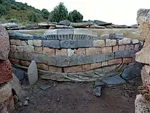 Starting from the late Bronze Age, a peculiar type of circular structure with a central basin and benches located all around the circumference of the room start to appear in Nuragic settlements, the best example of this type of structure is the ritual fountain of Sa Sedda e Sos Carros, near Oliena, where thanks to a hydraulic implant of lead pipes water was poured down from the ram shaped protomes inside the basin.[69] Some archaeologists interpreted these buildings, with ritual and religious function,[70] as thermal structures.[71]