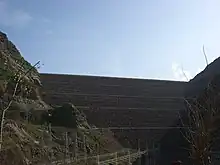 The Nurek Dam was constructed by the Soviet Union between the years 1961 and 1980. It is uniquely constructed, with a central core of cement forming an impermeable barrier within a 300 m (980 ft)-high rock and earth fill construction.[1][2][3] The volume of the mound is 54 million m3. The dam includes nine hydroelectric generating units, the first commissioned in 1972 and the last in 1979.[2] An estimated 5,000 people were resettled from the dam's flooding area.[4]