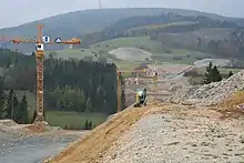Work on the Müß Tunnel commenced on 29 February 2008.[77] At the beginning of April 2008, Deutsche Bahn called tenders for the construction of the Masserberg, Rehberg, Kulch and Lichtenholz tunnels and the Dunkel, Reh and Mühlbach viaducts in September and November 2008 respectively.[78][79] By the end of 2008, all major civil engineering projects[65] and the construction of all "construction time-determining civil engineering works" would be awarded.[77] At the end of January 2009, the DB advertised tenders for the section from track-kilometre 15.8 to 18.0 (near Coburg) and the first 1.8 kilometre of the Coburg southern connection, each including one tunnel.[80] The invitation to tender for the integration of the line into the Erfurt node followed in July 2009.[81] This was to be carried out in nine stages with train operations continuing and was scheduled to be completed in 2017.[82]