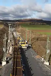 In June 2013, the Dörfles-Esbach connecting curve was connected to the existing network, in order to be able to carry the rails for the construction of the line, among other things.[97] The rails of the new line came from several large German track manufacturers and some were carried by goods trains on the lines from Coburg[98] and Erfurt.[99] At the end of November 2014 Deutsche Bahn announced that all 29 bridges on the new line had been completed.[100]