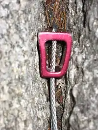 In rock climbing, a nut (or chock or chockstone) is a metal wedge threaded on a wire that climbers use for protection by wedging it into a crack in the rock. Quickdraws are clipped to the nut wire by the ascending climber and the rope threads through the quickdraw. Nuts come in a variety of sizes and styles, and several different brands are made by competing manufacturers. Most nuts are made of aluminum. Larger nuts may be threaded on Dyneema cord instead of wire, but this has become unusual.[1]