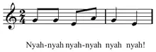 - Sometimes five-note, with the first two notes combined as one long note ("Nyaaahh nyah nyah nyah nyah") or other variations, such as the third note shortened or the fifth note stressed in volume, intonation, or duration, and so forth.