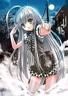 In order to blend in on Earth, Nyaruko, possessing the ability to shapeshift at will, assumes the appearance of a long, silver-haired petite human girl whose primarily attire throughout the series is a maid's outfit.[11][12] To get closer to Mahiro, she adopts the name Nyaruko Yasaka,[lower-alpha 4] pretending to be his cousin while staying at his house and attending his school as well, despite the fact that Nyaruko has already graduated from one of the best universities in the galaxy.[13] In regards to Nyaruko's romantic feelings for Mahiro, she relentlessly pursues him with the genuine desire to marry him and start a family together,[14] although her advances toward Mahiro simply annoy him and make him want to walk away from Nyaruko.[15][16]