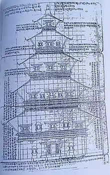 The first clue about written evidence about the Nyatapola temple came in 1984 when a scholar at the National Archives of Nepal, while cataloguing Nepal Bhasa manuscripts discovered a palm leaf manuscript titled as "siddhāgni koṭyāhuti devala pratiṣṭhā".[20] However, the name of the manuscript was likely written by a former scholar and not by its original writer.[20] The manuscript written in Nepal Bhasa contains the name, wage and work time of every single person who contributed in the construction, details and cost of every single religious ritual performed and the detailed time line of the construction.[4] The manuscript began with the following sentence: