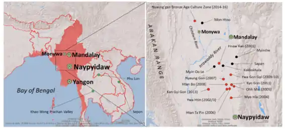 Nyaung-gan is a Bronze Age cemetery in central Myanmar, and was the first site in Myanmar to have artefacts dating to the Bronze Age.[1] Burials found over two seasons (1998–1999) were found to have grave goods consisting of pottery filled with animal bones, beads, spear points, terracotta and jewelry,[2] no iron was found at the site[1] and that provides a good benchmark to start with dating of the site. The site was initially thought to be a significant site due to surface findings, so a team was assembled to investigate the validity of that claim.[2] Myanmar is centrally located along trade routes that connect South, East, and Southeast Asia,[3] and has great potential to show cultural influence from all stops along those trade routes. Another unique aspect of the site is that the skeletons found in the burials were left in situ, and a museum was constructed around them.[2]