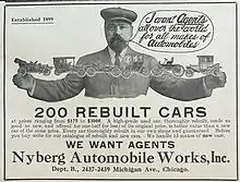 In 1903, Nyberg moved his workshop to Chicago on East 18th Street. With an investor named Waller, he built the Nyberg or Nyberg-Waller single-cylinder runabout automobile and in 1904 moved to a bigger building on South Michigan Avenue, which was also known as Automobile Row. After one season of selling the runabout the business began repairing and selling used cars. In 1907, with a new investor, H. E. Jennings, Nyberg Automobile Works, Inc. was incorporated and moved to a larger building on South Michigan Avenue, with the main business of re-building and re-selling automobiles.[1]