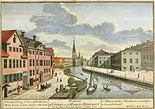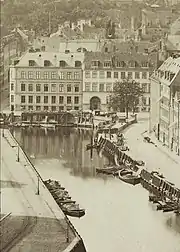 Krogh's property was home to a total of 45 residents at the time of the 1840 census. Krogh resided on the ground floor to the left with his wife Inger Marie Brick, their 24-year-old son Andreas Lauritz Kragh, a housekeeper (husjomfru), a maid and seven brewery workers.[7] Ludvig Ferdinand Veyle, a musician in the Royal Danish Orchestra, resided on the ground floor to the right with his wife Dorthea Hendriette Corfitsenm their three children (aged three to seven) and one maid.[8] Henriette Pauline Stage, widow of mate in the Danish Asiatic Company Georg Gottlob Stage (1766–1826), resided on the first floor with four unmarried children (aged 30 to 39), one maid and one lodger. One of the sons, Carl Frederik Gottlob Stage (1805-1892), a ship captain, would later become a ship-owner and founder of the Georg Stage Foundation,[9] Justus Alexander von Stricker (1778-1941), a colonel and director of the fire corps of the old Copenhagen County, resided on the second floor with his wife Maria Amalia Henricca (née Stintzing), their five children (aged 14 to 29), one maid and the lodger Johann Petersen Klodsstrou (soldier in the King's Regiment).[10] Carl Wilhelm Wichfeld, a clerk (kammerskriver) in General Tldkammeret, resided on the third floor with his wife Charlotte Amalie Petersen, their six-year-old son Carl Harald Ernst, one lodger and one maid.[11] Hans Petersen, a sand trader, resided in the basement with his wife Anne Sophie Jensenm their three children (aged eight to 12) and one maid.[12] The canal front in front of the building was the site of the so-called "Sandbox" /Sandkisten), a storage facility for sand. The sand was transported to the site by barge. It was then sold by the sand traders to the so-called "sandmen", who drove around in the streets with their carriages. Women would then call down to them from the windows: "Hey Sandman, come up with a skæppe!" (1 skæppe = 17.3 liter),