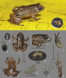 The frog has a small head, which is wider than it is long. The tympanum is indistinct. Adult males measure 13–15 mm (0.5–0.6 in) in snout–vent length. The dorsum is reddish-brown.[1]