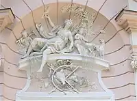 The southern staircase is flanked by two lion figures, which were probably erected on the front sides around 1769. They were made by Charles de Groff and consist of Regensburg Green Sandstone. The stairs link the castle with a wide meadow valley, the Löwental (lions valley).[35][36]