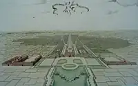 The northern and southern driveways run alongside the canal that runs from the city to the palace. They are the only part of a star-shaped avenue system planned by Joseph Effner for an ideal Baroque city (Carlstadt). In addition, it was planned to connect the elector's three summer residences (Nymphenburg, Schleissheim Palace and Dachau Palace) with canals. On the one hand the court society could move from one venue to the next with gondolas, and on the other - this provided a convenient transport route for agricultural products and building materials.[26][22]