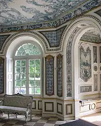 The ground floor consists of a single room, the Salettl, all in blue and white. Its walls are largely covered with Delft tiles. The niches and the flanks of the side cabinets, as well as the door to the staircase are covered with murals by Johann Anton Gumpp, that show numerous Asian gods. The ceiling is adorned with paintings of female personifications of four continents.[38]